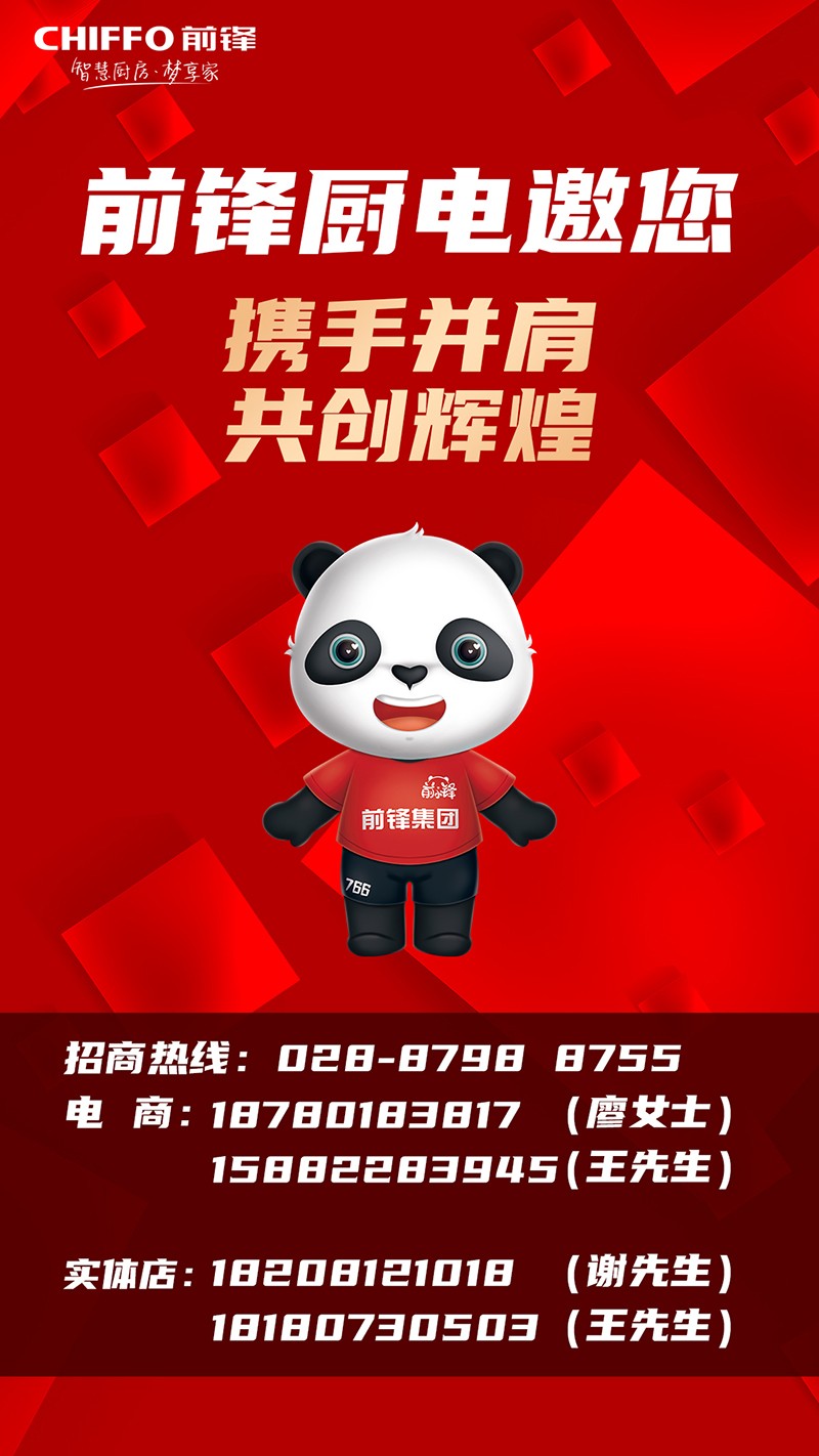 即日起,為了將前鋒廚電的產(chǎn)品和服務帶給更多的消費者,我們現(xiàn)正面向全國進行招商加盟。無論你是家電行業(yè)的資深人士,還是創(chuàng)業(yè)新手,只要你有夢想、有熱情,我們都歡迎你的加入!